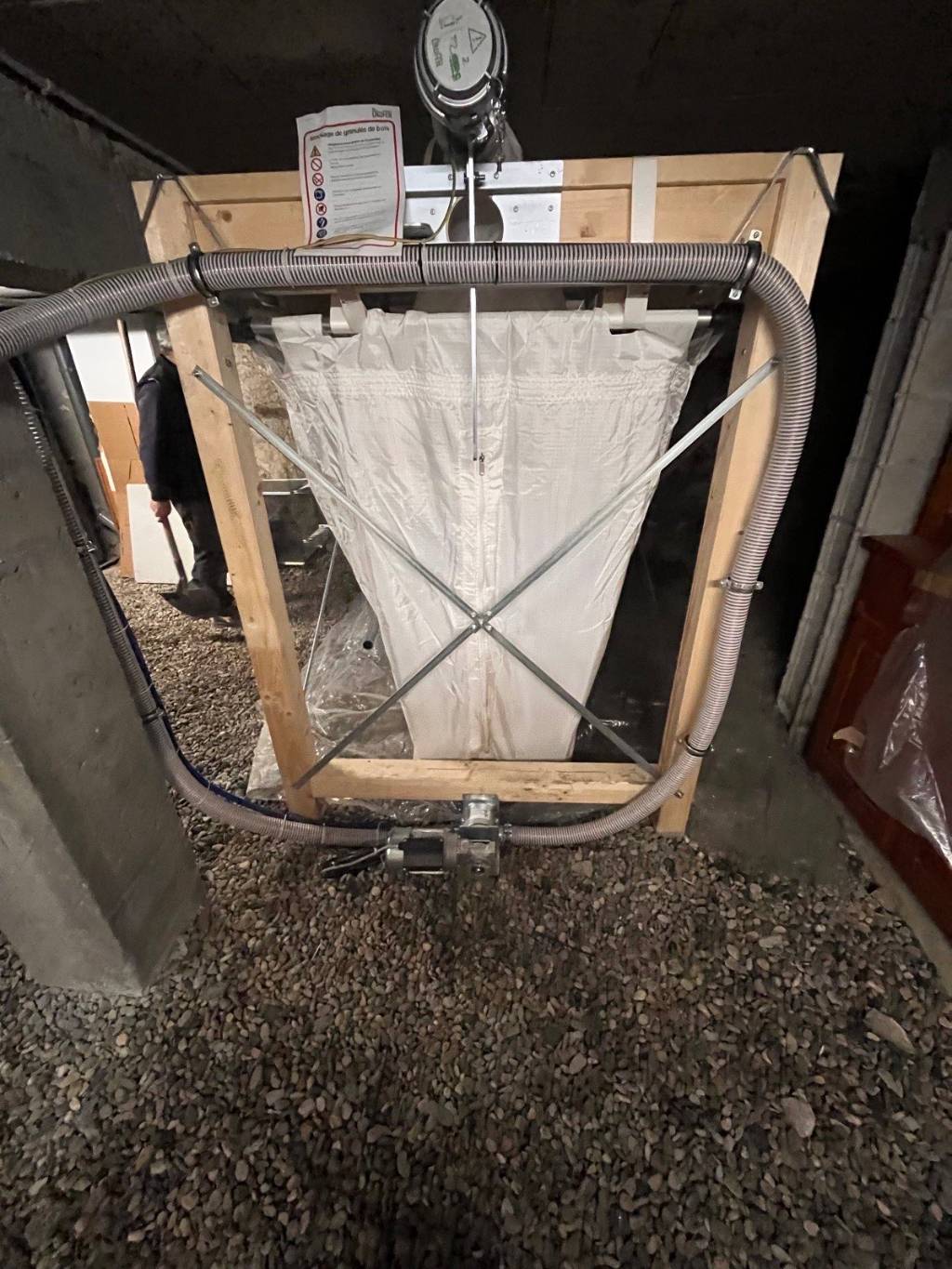 Installation d'un silo textile d'une capacité pouvant aller jusqu'à 4.7 tonnes selon la hauteur disponible dans la pièce de reserve. Il est raccordé un tuyau d'aspiration permettant d'acheminer les granulés du silo jusqu'à la chaudière à granulés Okofen.